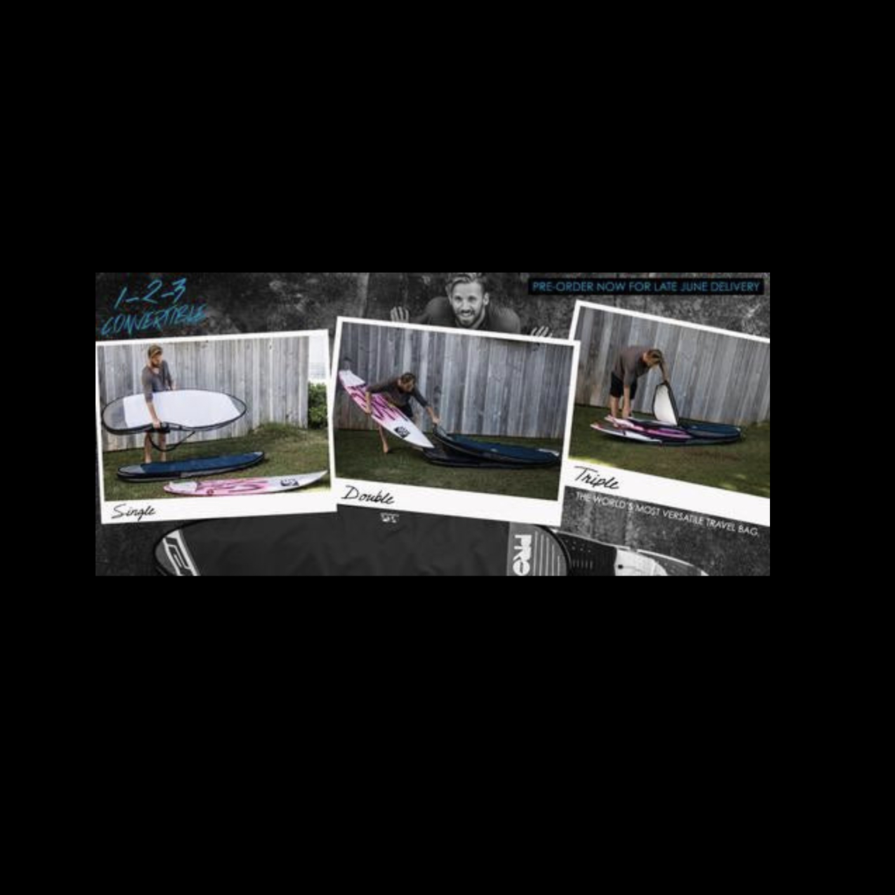 The Prolite 1-2-3 Convertible is a travel bag designed for shortboards that can be zipped apart to carry one, two, or three boards. It features thick padding and durable materials to protect your boards during airline travel.